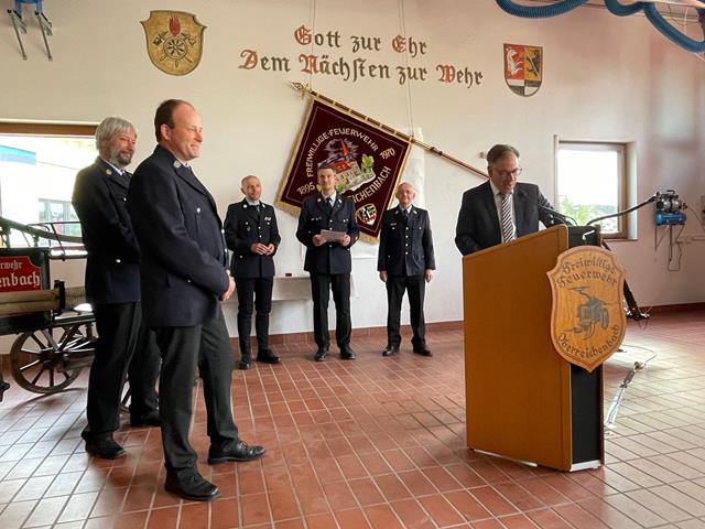 Der 1. Vorsitzende der FFW Oberreichenbach Michael Maier begrüßte herzlich alle Anwesenden und führte im Folgenden durch das Programm. Neben den aktiven Feuerwehrfrauen und Feuerwehrmännern unserer Feuerwehr waren Vertreter der Gemeinde und Vertretungen der benachbarten Wehren und des Landkreises eingeladen. Kommandant Thomas Heisler informierte die Gäste über die langwierige Zeit der Ausschreibung und erläuterte technische Details des neuen Fahrzeugs. Die nächsten Redner Landrat Alexander Tritthart, Bürgermeister Klaus Hacker und Kreisbrandrat Matthias Rocca betonten die große Relevanz der Freiwilligen Feuerwehren im täglichen Leben und lobten besonders das ehrenamtliche Engagement im aktiven Dienst. Der Vorsitzende unserer Partnerwehr aus Herzogenaurach Thomas Geiger richtete ebenfalls Grußworte an alle Anwesenden.